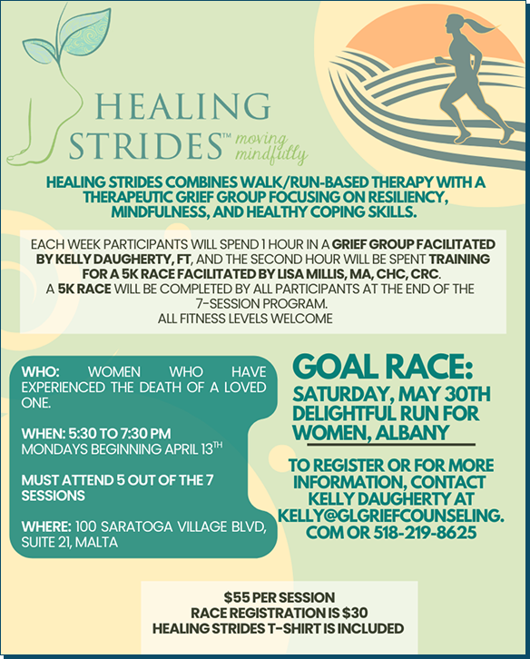 Healing Strides is a seven-week seasonal program available in the Fall and Spring. It is designed for women grieving the death of a loved one. Each session consists of a one-hour therapeutic grief group and an hour of 5K race training. Participants complete the race at the end of the program.