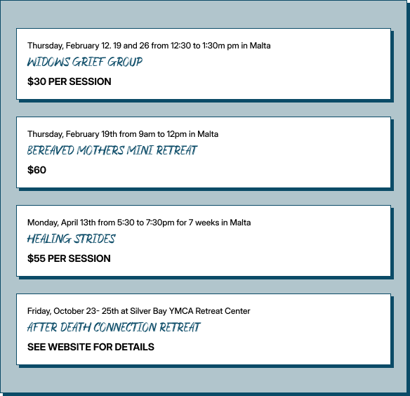 A variety of grief groups are offered throughout the year in Malta, NY, as well as virtually via Zoom for anyone in NY, FL, or SC.